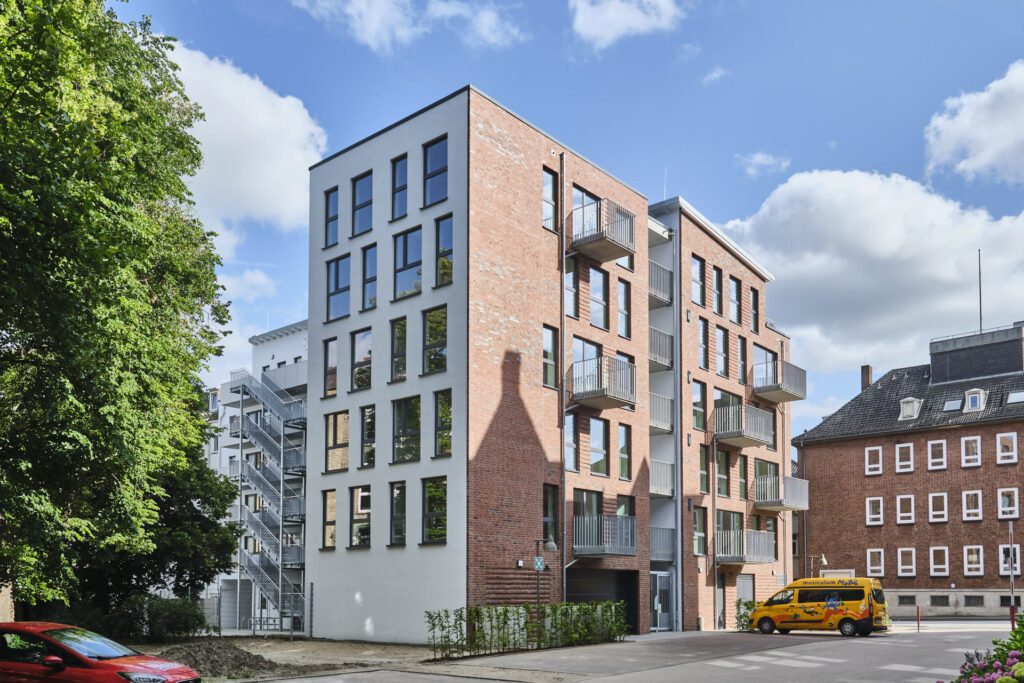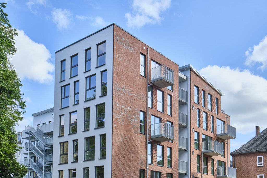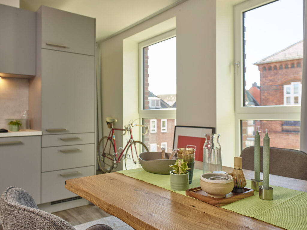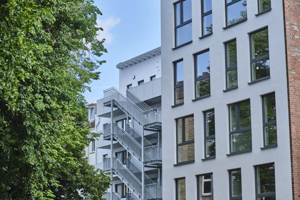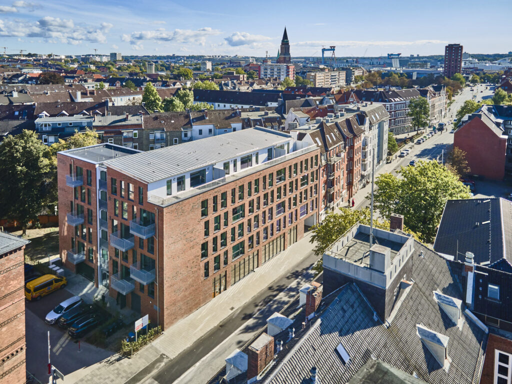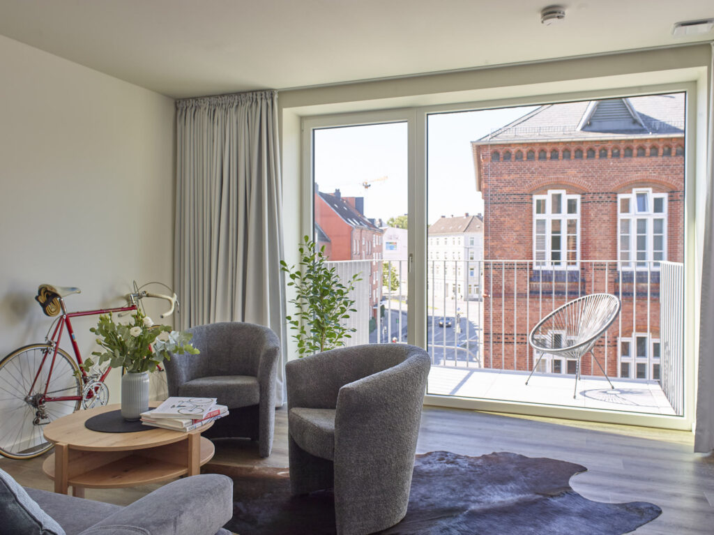 Modernes Wohnen für Studierende, Azubis, junge Berufstätige, Paare oder Singles in Kiel. Dieses Projekt zeichnet sich durch seine klare Formensprache und eine konsequente, barrierefreie Gestaltung aus. In dieser Fotostrecke haben wir die architektonische Qualität von „The Mingle“ festgehalten – mit besonderem Blick auf die Lichtführung in den Apartments und die architektonische Öffnung hin zum Gemeinschaftsbereich. Unsere Bilder betonen die Materialität des Neubaus und die nahtlose Integration in das urbane Umfeld, die dieses Gebäude zu einem modernen Ankerpunkt in Kiel macht.